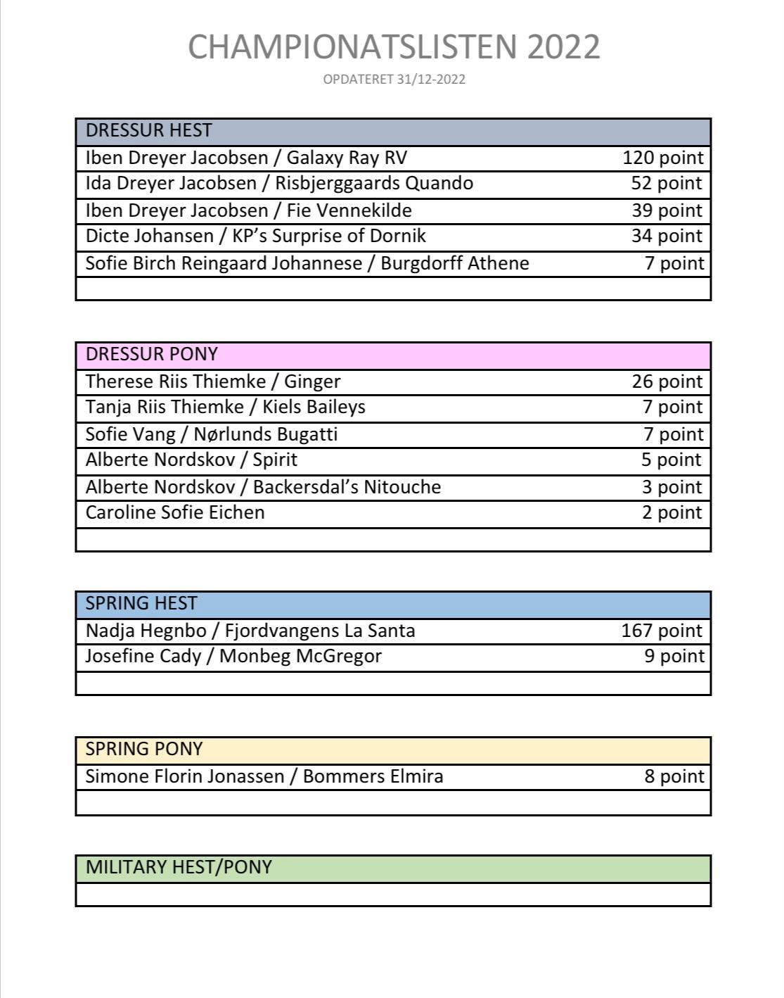 ENDELIGT RESULTAT FOR 2022 - CHAMPIONATSVINDERE